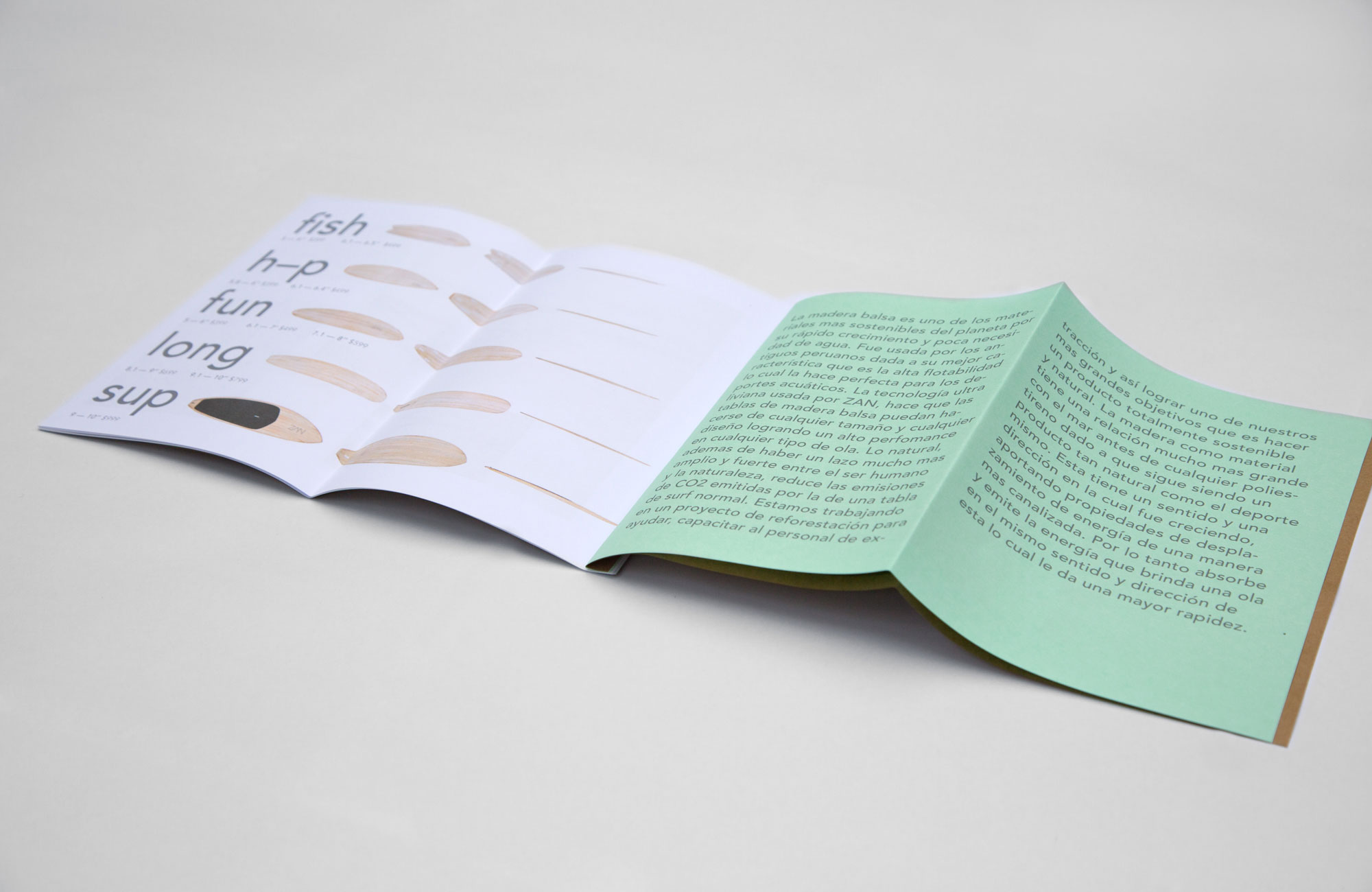 Catalogue design for ZAN - producing bespoke wooden surfboards. Home printing and hand-made stapling - 30 copies.